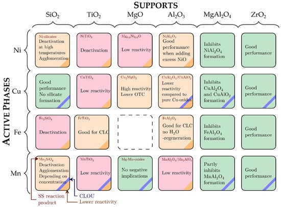 The reactor design and its operation depend greatly on the properties of the oxygen carrier materials. With good kinetics (high oxygen carrier mass conversion rate, the high extent of oxygen carrier mass conversion, and high extent of fuel conversion), the oxygen carrier bed mass can be decreased, leading to reduced capital and operational costs [70]. Other oxygen carrier properties are also of vital importance as they affect the lifetime of the oxygen carrier bed (see Section 3 for more detailed information). The oxygen carrier size and porosity are especially important for continuous fluidized operation, as these affect the hydrodynamics inside the reactor and thus the optimal reactor design. Every reactor design can smoothly circulate a certain size range of oxygen carrier particles [70].