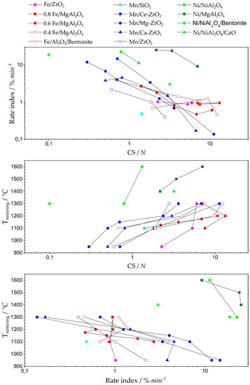 The size of these particles also influences their reactivity. With large particles, a high intraparticle diffusion resistance may result in a decreased extent of the oxygen carrier mass conversion towards the interior of the particles [70]. This becomes increasingly important in continuous operation, where oxygen carriers are rapidly circulated through the different reactors. When the residence time of the oxygen carriers in the respective reactors is too short for the reactants to reach the core of the oxygen carrier, a (partially) unreacted core will remain after the oxygen carrier is transported to the next reactor. This will reduce the actual oxygen transfer capacity of the material. When significant intraparticle diffusion resistances occur, the solids inventory needs to be increased to ensure good operation. To limit intraparticle diffusion resistances, the porosity of the oxygen carrier particles could be increased, but this might negatively affect crushing strength (see Section 3.4). When the oxygen carriers are too small, increased entrainment, agglomeration, and de-fluidization are observed [70].