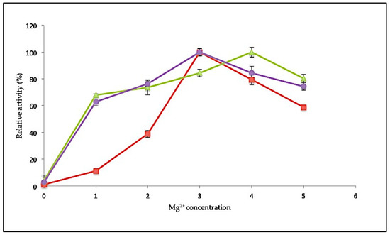 Effect of magnesium ion concentration toward SK72 DNA polymerase I activity and its variants. Note: SK72 (red), SK72-Exo (green), and SK72-Exo2 (purple). The assay took place at optimum temperature for each variant and incubation for 30 min. The control consists of an absence of metal ions (0 mM) relative to the maximal activity for each experiment. Error bars represent standard deviation (n = 3). Absence of the bar indicates that the error is smaller than the symbols.
