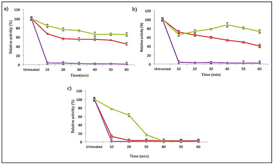 The SK72 DNA polymerase I and its variants were earlier identified as a slightly thermostable enzyme that was remarkably active at temperatures ranging from 40 to 60 °C. Apart from the effect of N-terminal domain deletion on the temperature and pH profile, this large fragment of SK72 DNA polymerase I could synergistically increase the protein stability and rigidity. A strong conformational structure is a key factor in enzyme stabilization. On this relevance, Figure 7 denotes the thermostability study of SK72 DNA polymerase as compared to its variants at three different temperatures: 50, 60, and 70 °C. Excellent stability was observed in SK72-Exo, where it was able to maintain almost 80% of its activity throughout the total incubation period at 50 and 60 °C but decreasing at 70 °C after 20 min of incubation. Meanwhile, SK72 was only able to retain half of its activity up to 60 min both at 50 and 60 °C and dropping drastically after 10 min of incubation at 70 °C.