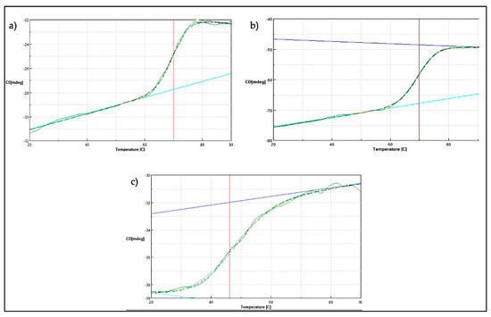Thermal denaturation profile of SK72 DNA polymerase and its variants. (a) SK72, (b) SK72-Exo, (c) SK72-Exo2. Vertical line (red) indicating the melting point value of each variant when tested from temperatures ranging from 20 to 90 °C.