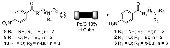 Synthesis of procainamide (1), procaine (2) and butacaine (3). Reaction conditions: solution of compound 8, 9 and 10 in EtOAc (50 mg/mL), T = 60 °C, P = 10 bar.