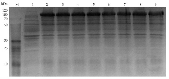 SDS-PAGE analysis of eight fusion proteins with different organizations. Lane M, protein marker; lane 1, no induction of the fusion enzyme as the control; lane 2, VsHGB-GSG-SoGOX-GSG-HpCAT; lane 3, VsHGB-GSG-SoGOX-GGGGS-HpCAT; lane 4, VsHGB-GGGGS-SoGOX-GSG-HpCAT; lane 5, VsHGB-GGGGS-SoGOX-GGGGS-HpCAT; lane 6, HpCAT-GSG-SoGOX-GSG-VsHGB; lane 7, HpCAT-GSG-SoGOX-GGGGS-VsHGB; lane 8, HpCAT-GGGGS-SoGOX-GSG-VsHGB; lane 9, HpCAT-GGGGS-SoGOX-GGGGS-VsHGB. The crude enzyme samples were run by PAGE (12% acrylamide) and stained with Coomassie Brilliant Blue R-250.