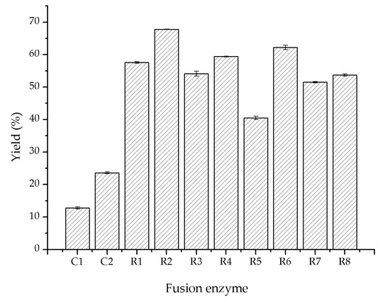 Comparison of different fusion enzymes on catalytic performance of alcohol oxidation. C1, SoGOX alone as the control; C2, the control co-expressing SoGOX, HpCAT and VsHGB separately; R1, VsHGB-GSG-SoGOX-GSG-HpCAT; R2, VsHGB-GSG-SoGOX-GGGGS-HpCAT; R3, VsHGB-GGGGS-SoGOX-GSG-HpCAT; R4, VsHGB-GGGGS-SoGOX-GGGGS-HpCAT; R5, HpCAT-GSG-SoGOX-GSG-VsHGB; R6, HpCAT-GSG-SoGOX-GGGGS-VsHGB; R7, HpCAT-GGGGS-SoGOX-GSG-VsHGB; R8, HpCAT-GGGGS-SoGOX-GGGGS-VsHGB. The reaction mixture (5 mL) contained 10 mg crude enzyme, 100 mM methyl glycolate, 0.01 mM FMN and 50 mM Tris-HCl (pH 8.0). The reaction at an oxygen aeration rate of 1 L/h was carried out at 25 °C and 600 rpm for 4 h.