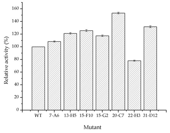 A colorimetric assay was used for primary screening of the evolved mutants [30]. The oxidation of methyl glycolate produced methyl glyoxylate and H2O2. Thus, the detection of H2O2 could reflect the level of glycolate oxidase activity. Using the kit of H2O2 determination, H2O2 oxidized Fe2+ to Fe3+, which then combined with dye molecules to produce purple Fe3+-dye complexes. The concentrations of H2O2 were measured by detecting the absorbance at 595 nm (Figure S4). Transformants from the mutant library were incubated in a 96-deep well plate (Qiagen, Hilden, Germany) with each well containing 500 μL of liquid LB medium and 100 μg/mL kanamycin. After an overnight growth at 37 °C, 10 μL culture was inoculated into another 500 μL fresh LB culture containing 0.2 mM IPTG and 100 μg/mL kanamycin, followed by 12 h induction at 25 °C and 150 rpm. After that, the culture was centrifuged at 8000× g for 10 min and the supernatant was discarded. Then, the cells were re-suspended using 100 μL cell-lysis solution (Tris-HCl buffer, pH 8.0, 1 mg/mL lysozyme, 2 mM EDTA, 100 mM NaCl and 0.5% Triton X-100) and three cycles of freeze-thawing were conducted to disrupt the cells. After the centrifugation of 4000× g for 20 min, the supernatant was used as the crude enzyme. The crude enzyme in the 96-deep well plate was transferred and mixed with methyl glycolate at a final concentration of 100 mM. After the reaction at 37 °C for 8 h, 20 μL reaction mixture was mixed with 200 μL colorimetric solution. The absorbance at 595 nm was determined with a spectrophotometer (Thermo Scientific, Shanghai, China) after 30 min colorimetric reaction at 25 °C, mutants exhibiting a higher absorbance than the control were picked out for further verification (Figure S5).