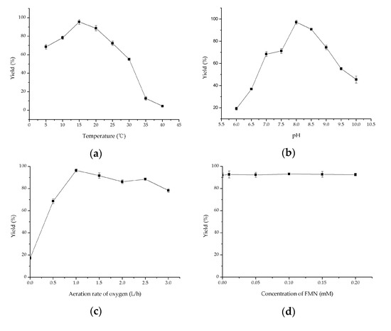 To integrate the improvements of the fusion expression and directed evolution, the double substitutions M267S and S362G were introduced into the fusion enzyme VsHGB-GSG-SoGOX-GGGGS-HpCAT, yielding the fusion enzyme VsHGB-GSG-SoGOXmut-GGGGS-HpCAT. When tested under the same catalytic conditions, the reaction yield of crude enzyme VsHGB-GSG-SoGOXmut-GGGGS-HpCAT was 1.2 times higher than that of crude enzyme VsHGB-GSG-SoGOX-GGGGS-HpCAT. Hence, crude enzyme VsHGB-GSG-SoGOXmut-GGGGS-HpCAT was used as biocatalyst for subsequent the orchestration of reaction conditions. During cascade biocatalysis, the enzymes SoGOXmut, HpCAT and VsHGB run in the same pot and the optimal conditions of each enzyme are usually not be met [16]. Thus, we investigated various factors affecting alcohol oxidation, including temperature, pH, aeration rate of oxygen, the concentration of FMN and the substrate concentration. The fusion enzyme was active over a range of 5–40 °C, and the highest yield (70.35%) was observed at 15 °C (Figure 5a). Higher temperature (>15 °C) decreased the product yield. Since HpCAT was a moderately thermostable enzyme [22], the thermal optimum was mainly associated with that of SoGOXmut. The optimal pH of alcohol oxidation was tested at the pH values ranging from 6.0 to 10.0 at 15 °C. The optimal pH was observed to be pH 8.0 (Figure 5b), at which spontaneous hydrolysis of methyl glycolate was kept at a relatively low level (<2%) (date not shown). The effect of oxygen supply was determined by varying the aeration rate of oxygen from 0 to 3 L/h, and the optimal aeration rate was proved to be 1 L/h (Figure 5c). SoGOX is FMN-dependent and the effect of FMN was investigated by supplementing exogenous FMN from 0 to 0.2 mM. Under the tested conditions, the addition of exogenous FMN had no benefit for the oxidation of methyl glycolate, suggesting endogenous FMN met for the requirement of the oxidation of methyl glycolate (Figure 5d). When the substrate concentration increased from 50 to 200 mM, the yields were kept at a high level (>95%) (Figure 5e). A further increase of substrate concentration to 400 mM resulted in a sharp decrease in the yields, which might be attributed to the enzyme inactivation originated from higher concentrations of hydrophobic compounds and the accumulation of aldehyde toxicity [32]. Last but not least, the efforts of protein engineering toward further improvement of SoGOX activity and aldehyde tolerance are ongoing in our laboratory.