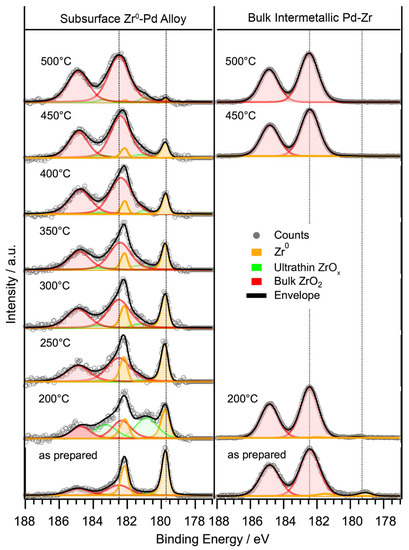 - Li, H.; Choi, J.-I.J.; Mayr-Schmölzer, W.; Weilach, C.; Rameshan, C.; Mittendorfer, F.; Redinger, J.; Schmid, M.; Rupprechter, G. Growth of an ultrathin zirconia film on Pt3Zr examined by high-resolution X-ray photoelectron spectroscopy, temperature-programmed desorption, scanning tunneling microscopy, and density functional theory. J. Phys. Chem. C 2015, 119, 2462–2470. [Google Scholar] [CrossRef]