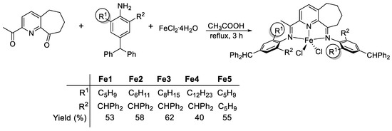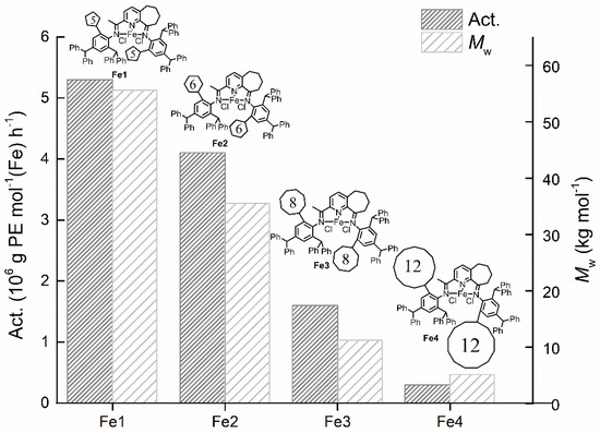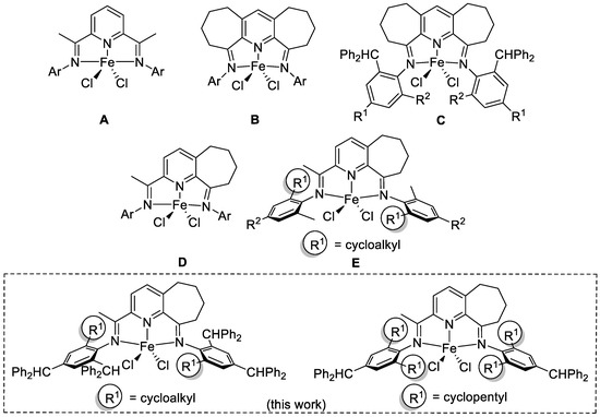 - Guo, J.; Zhang, W.; Oleynik, I.I.; Solan, G.A.; Oleynik, I.V.; Liang, T.; Sun, W.-H. Probing the effect of ortho-cycloalkyl ring size on activity and thermostability in cycloheptyl-fused N,N,N-iron ethylene polymerization catalysts. Dalton Trans. 2020, 49, 136–146. [Google Scholar] [CrossRef] [PubMed]
