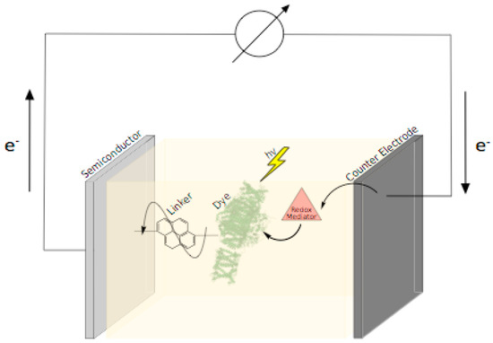 General schematic showing the key working components of a biohybrid photoelectrosynthetic cell. The figure shows a bio-absorber (dye), after light excitation donating an electron through a linker to a semiconductor surface. This electron is then passed to the counter electrode where it interacts with a redox mediator that reduces the oxidized bio-absorber and completes the circuit.