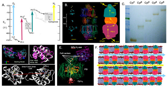 It may be possible to use synthetic biology and nanofabrication to create an immobilization platform that sequesters the hydrogen production chemistry (PSI and catalyst) from the water splitting chemistry (PSII). In this way the O2 sensitive catalyst, such as the H2-ase or other catalyst, can be separated from oxygen production by a water-splitting system (PSII or synthetic). One such configuration is shown in Figure 5, where the use of a self-assembled 2D array of PSI and PSII can be supported using some synthetic polymer matrix that replaces a lipid bilayer (Figure 5E). Recently, there has been progress in isolating photosynthetic reaction centers [112,113] and other electron transport complexes [114] without detergents using styrene maleic acid copolymers. These polymers surround not only the membrane protein(s) but also a significant boundary layer that may stabilize the protein in a more native confirmation. As a synthetic polymer, these SMAs are very amenable to chemical functionalization that may permit cross linking within the lateral bilayer region [115]. Relevant to this goal, these SMALP proteins have been shown to be more stable [116,117] and in the case of PSI have even been shown to undergo more rapid photochemistry [118]. These layers can be assembled into a multilaminar array with a conductive nanowire connecting PSII to PSI. Although cyt c6 is not a normal electron acceptor of PSII, there is over 800 mV of driving force that may enable this alternate path of electron transfer in vitro (Figure 5A). Such a connection has been shown using soluble electron transfer proteins such as cyt c6 to ferry electrons between PSII and PSI (Figure 5B). The diffusion time can be reduced by making a nanowire to bridge this distance. As is shown in Figure 5C, we have already been able to clone and express a multimeric cyt c6 polyprotein of five head-to-toe subunits that will assemble correctly in E. coli. MD simulations suggest that each cyt-cyt linkage can extend the heme-heme spacing by ~3.0 nm. The final device structure may involve multiple layers of a polymer-embedded PSII–PSI complex. This design will successfully enable O2 evolution from the splitting of H2O in one chamber and the hydrogen evolving catalyst producing H2 in a second chamber (Figure 5E). By physically separating these two chemical conversions, the device will recapitulate the natural design of how cyanobacteria separate these two processes during nitrogen fixation in a heterocyst.