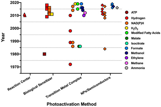 Timeline of selected biohybrid artificial photosynthetic studies. This has been organized by light active material and targeted catalytic product. Chemical products are color coded and separated by photoactivation method.