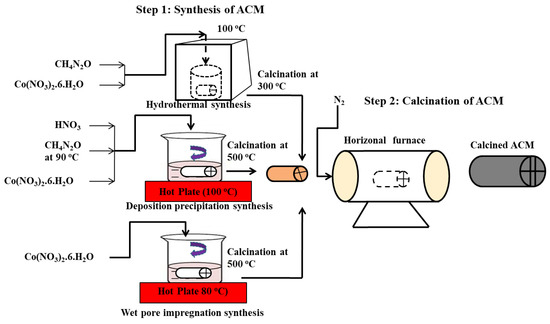 The catalytic activity and selectivity of a metal oxide is correlated with certain characteristics, such as oxygen non-stoichiometry, composition, surface area, volume, shape, reducibility, and pore structure [4,68]. In addition, the key considerations in preparation include the choice of active chemical composition, promotion of catalysts, active phase deposition methods, and oxidative and reductive treatments [4]. Furthermore, the support should have the following properties: high surface area and acidity, pore volume, thermal conductivity, and reactivity [69]. Figure 3 shows the procedure for monolith/Co3O4-based catalysts by impregnation of pore volume, precipitation of deposition, and methods of hydrothermal synthesis [70].