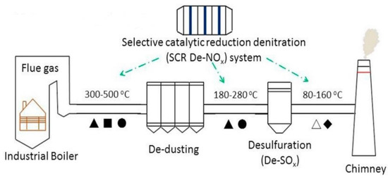 Adsorption is a simple and cheap method for extracting process gases and vapors from the atmosphere, and the adsorption of contaminants by regenerable catalysts is becoming common in reducing the menace of air pollution [12]. Recently, the multipollutant simultaneous removal techniques used to include carbon-based material adsorption and nonthermal plasma (NTP) technologies [13]. In addition, attention has been paid to the chemical reaction of acid gases with a metal oxide (chemical adsorbent) or the actual sorption of solids (atomic adsorbent) [14]. The solid adsorbents commonly used in controlling flue gas pollutants are the non-regenerative (CaO and MgO) and regenerative (zeolites, silica gel, charcoal, etc.) adsorbents [15]. The final disposal of the exhausted catalyst is a paramount topic of research. Commonly, a layer of sealant, such as bitumen, polyethylene or concrete, is used to encapsulate catalyst residues that may cause environmental problems [16]. In terms of economy, the regeneration of the exhausted catalyst is preferred over the adsorbent replacement [17].