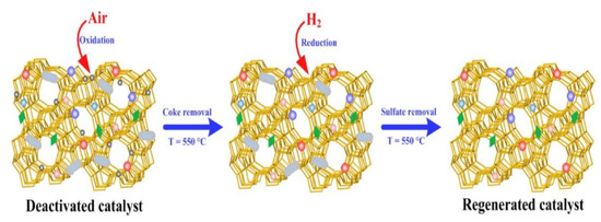 where, is the relative loss of activity, the conversion, and indices 0 and t stand for times of exposure [81]. The blockage of active sites as a result of poisoning are discussed in detail elsewhere [62,79,80,81,82,83]. Table 4 shows the types, treatment, and causes of catalyst deactivation.