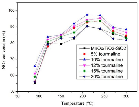 The XRD spectra of MnOx/TiO2 catalytic materials with different tourmaline content is shown in Figure 4. It can be seen from the figure that tourmaline was not consumed during the reaction process, but was successfully doped into the catalytic materials, and at the same time, the crystallinity of the catalytic materials was affected to varying degrees. As mentioned above, amorphous catalytic materials play a more important role in the denitration reaction, while the tourmaline surface has a strong interaction. Their spontaneous permanent electrodes attract or repel each other. Once successfully incorporated into the catalytic materials, they can effectively promote the dispersion of their powders and then change the crystalline integrity. This is one of the reasons that tourmaline affects the denitration activity of catalytic materials.