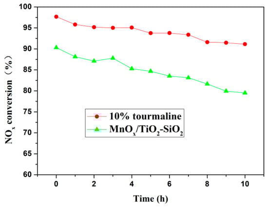The denitration effect of catalytic materials improved most obviously when the content of tourmaline was 10%; therefore, in the stability evaluation experiment, we compared the denitration rate of catalyst materials before and after adding 10% tourmaline at 200 °C for 10 h, the results are shown in Figure 2.
