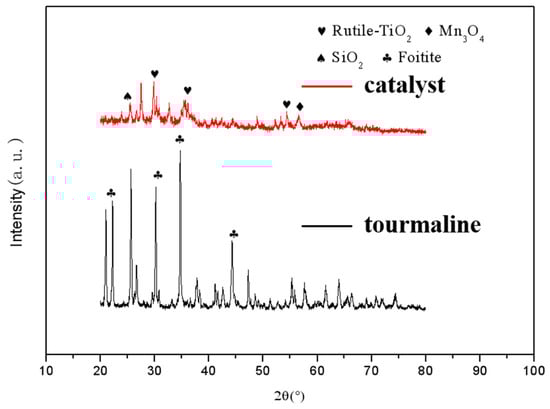 XRD diagrams of tourmaline and MnOx/TiO2 catalytic materials.