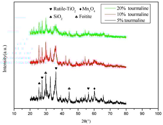 XRD diagram of MnOx/TiO2 catalytic materials with different tourmaline content.