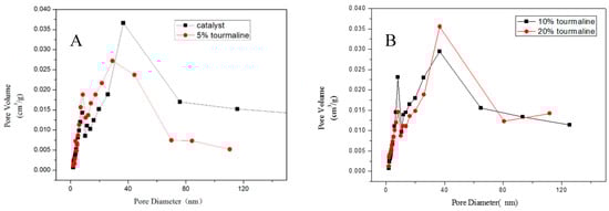 By contrasting the pore volume of several samples with the corresponding pore size, the particle size distribution of MnOx/TiO2 catalytic materials with different tourmaline content was acquired, as shown in Figure 5. Comparing the obtained curves with the existing sixth typical adsorption isotherms, it can be observed that the adsorption isotherms of several catalytic materials belong to type IV. The adsorption–desorption isotherms are inconsistent, which is attributed to the phenomenon of capillary condensation [11,12]. Meanwhile, the hysteresis loop in the diagram belongs to type H1. Their appearance is often related to the type and size of pore structure in the catalytic materials, which means that the channel connectivity between the mesopores of the catalytic materials is very great, and the size of the pore is almost the same. The hysteresis loop also shows that the catalytic materials with different tourmaline content belong to mesoporous structure, and the pore size is between 2 and 50 nm, which corresponds to the results measured by the instrument in Table 1.