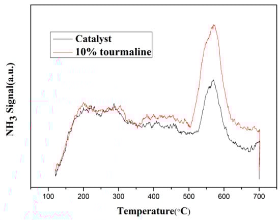The experimental results show that the denitration activity and specific surface area of catalytic materials are the maximum when the content of tourmaline is 10%. Therefore, the following work mainly focuses on the performance changes of MnOx/TiO2 catalytic materials before and after adding 10% tourmaline. The test results of NH3-TPD are shown in Figure 6. As shown in the figure, there is only one desorption peak for both catalytic materials before and after doping with tourmaline, which indicates that the intensity distribution of acid sites on the surface of the catalytic materials is concentrated, the desorption peak strength of the 10% tourmaline-doped MnOx/TiO2 catalytic material is obviously higher than that before doping and the integral area of the curve can effectively represent the number of acid sites, that is, the addition of tourmaline greatly increased the number of acidic sites on the surface of the catalytic material. The temperature range of NH3 desorption is 500~600 °C, which belongs to the high temperature desorption peak. This indicates that NH3 desorption mainly comes from strong acidic sites on the surface of catalytic materials. According to the denitration rate curves of different catalytic materials in Figure 1, tourmaline can effectively promote the dispersion of catalytic materials, thus increasing the number of acidic sites on the surface of catalytic materials. Therefore making the molecules of reaction gases more easily adsorbed on the surface of catalytic materials and further activated, which is the chief reason for the increase of denitration rate.
