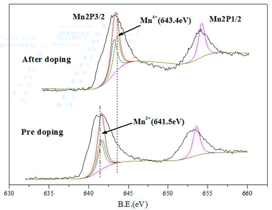 The valence states of the elements in the active components of catalytic materials also affect their denitration activities to a great extent [15,16]. In order to analyze the changes of surface element composition and valence state of MnOx/TiO2 catalytic materials before and after adding tourmaline, XPS analysis was carried out for different catalytic materials. Figure 7 shows the Mn2p XPS spectra of catalytic materials before and after adding 10% tourmaline. It is found that there are two peaks in the spectra. The two main peaks correspond to Mn2p3/2 (641.7 eV) and Mn2p1/2 (653.6 eV), respectively. This indicates that Mn in the catalytic materials exists in various valence states [17]. The measured data can be divided into peaks and fitted by XPS peak software, and the corresponding peaks with different valence manganese ions can be obtained. At the same time, the proportion of different valence manganese ions in catalytic materials can be calculated to facilitate further analysis of the reaction mechanism. The peak of binding energy in 641.5 eV in the figure corresponds to trivalent manganese ions, while the peak of binding energy in 642.1 eV corresponds to tetravalent manganese ions [18].