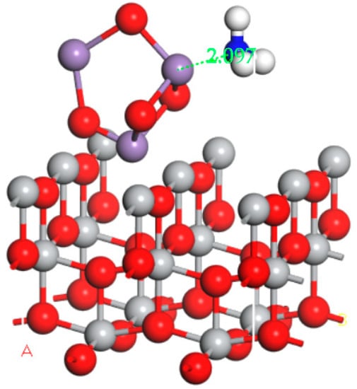 According to the XRD analysis results, the main active component of the catalyst was Mn3O4; the major carrier was TiO2. Therefore, the construction of the catalyst model was selected as Mn3O4/TiO2. The obtained geometries for NO and NH3 molecules adsorbed on the surface of the Mn3O4/TiO2 model in the electric field was shown in Figure 8 and Figure 9, respectively. As we can see from the diagram, the NO molecule was inclined to adsorb above the Mn atoms with its N end; the distance between N atom and Mn was 1.727 Å. Simultaneously, the NH3 molecule was also liable to adsorb above the Mn atoms with its N end; the distance between N atom and Mn was 2.097 Å.