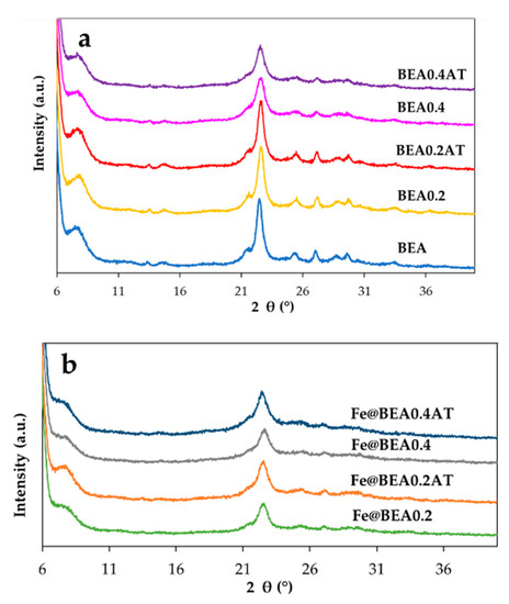 X-ray diffraction patterns of (a) parent and modified BEA samples, and (b) immobilized Fe catalysts. For the samples’ designations, see the Materials and Methods section.