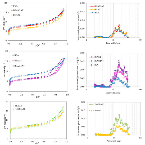The mesopore distributions (Figure 2, right side) were obtained through Hybrid Density Functional Theory (DFT Plus (R) V2.01 for ASAP 2010 V5.00 assuming cylindrical pores. Overall, modified samples as well as the pristine zeolite present broad mesopore size distributions and the large majority of pore widths fall in the region 10–40 nm. On the other hand, a closer examination highlights that while for BEA0.2 and BEA0.2AT, the distribution is very similar to BEA, in the case of BEA0.4 and BEA0.4AT, there is an evident difference on the volume of mesopores, when compared to BEA, or BEA0.2, and an accentuated increase in the pores with width in the region between 10 to 20 nm. In the case of sample Fe@BEA0.2, a wider pore width distribution can be observed, starting at lower values, from around 7 nm.