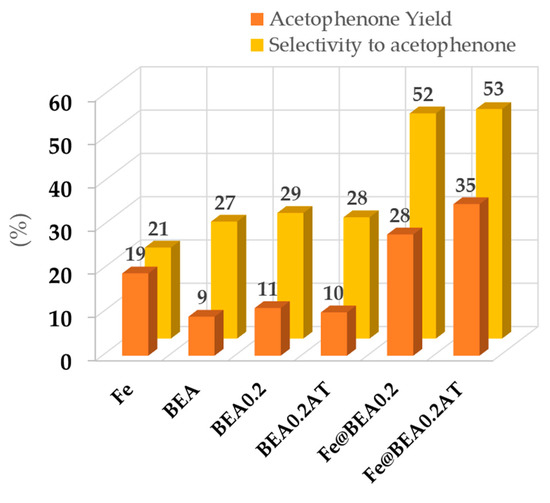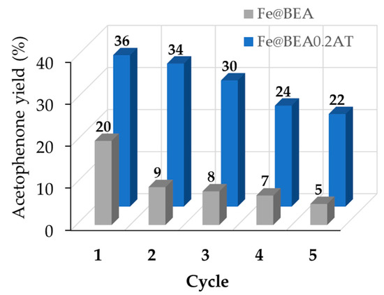 In this study, the ability to reuse the spent catalysts was evaluated over several consecutive cycles. The catalysts Fe@BEA and Fe@BEA0.2AT were therefore subjected to five consecutive reactions (Figure 5). For the iron immobilized in the commercial zeolitic support, Fe@BEA, a sharp drop of more than 50% of the acetophenone yield is observed after the first cycle, while maintaining the yield in the third and fourth cycles. The significant loss of activity from the first to the second cycle pointed out the lack of stability of this material and was a reason why Fe leaching was not further investigated in this case.