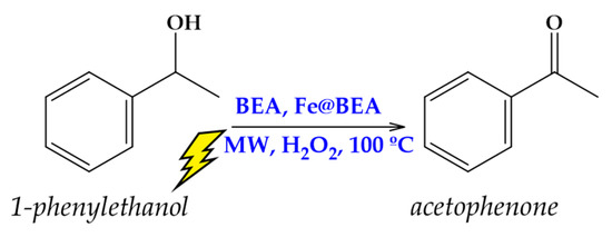 MW-assisted oxidation of 1-phenylethanol to acetophenone with hydrogen peroxide catalyzed by BEA and Fe@BEA materials.