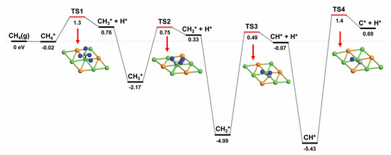 The successive steps of CH4 dissociation start with the physical adsorption of CH4 (g) on the Ni2Cu (111) surface to form CH4*(* denotes an adsorption state). Then, the activation energy in the first step of CH4 dissociation is found to be 1.30 eV, as shown in Figure 2. The first transition state shows the detached H atom located at the HCP site [33], and the remaining CH3 fragment settled down at 2.08 Å to achieve maximum C–H–Ni three-center bonding [34,35]