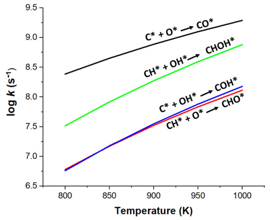 Figure 9 shows the temperature effect on carbon elimination reactions. The reaction of C* + O* has the highest rate constant in all carbon elimination reactions, followed by CH* + OH*. C* + OH* and CH* + O* reactions have similarly low rate constants as a function of temperature. OH* is the primary oxidizing agent for CH*, whereas atomic O is dominant in coke removal at different temperatures. It indicates that coke deposition by atomic O is easily removed at higher temperature ranges. On the other hand, it also reveals the importance of OH species in bypassing the coke formation step from CH dissociation where kCH/kC(OH) >> kCH/kC(O), as shown in Figure 10. Comparing these results with previous studies [42,43], we can conclude that carbon elimination via C* + O* is enhanced in Ni2Cu (111) system over the Ni2Fe (111) and pure Ni (111) systems [19,25,28]. It suggests that the incorporation of Cu to Ni–Ni surface can simultaneously improve carbon elimination by C* + O* reaction, while reducing carbon deposition via CH dissociation. The higher the Cu/Ni ratio, the more it is expected to suppress catalyst activity when occupying the Ni active site. This result is consistent with the experimental results [22,24].