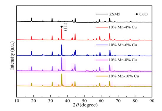 The XRD pattern of Mn-Cu/ZSM5 catalysts with different loadings of 4%, 6%, 8%, and 10% Cu are shown in Figure 2. The Mn was not found in the XRD pattern. On the one hand, a small amount of Mn-based metal oxide catalysts were present in the amorphous state. On the other hand, the Mnn+ ions were incorporated into the Cu oxide lattice, and then it tends to form a solid solution during the calcinations based on related research [38,39]. Tang et al. found that the amorphous MnOx played an important role in the removal of NOx [40]. Boningari et al. revealed that amorphous MnO2 was of higher activity if compared with crystalline MnO2 for NO reduction [41]. Fang et al. reported that some Mn oxides are strongly associated with Cu oxides to form CuMn2O4, which was an active oxidation catalyst because of the easy electron transfer between Mn and Cu ions without a change in lattice, improving the lattice oxygen mobility and redox quality [42]. The (111) crystal planes of crystalline CuO were detected at 37°. Zhao et al. reported that the chemical forms of Cu species were present nearly exclusively in the form of oligomeric species and mononuclear ions [43].