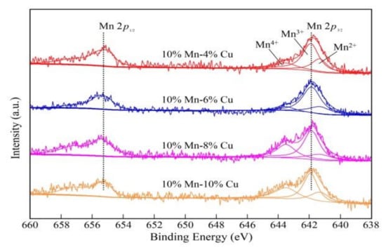 Figure 3 shows the XPS pattern of Mn-Cu/ZSM5 catalysts with different loadings of 4%, 6%, 8%, and 10% Cu, respectively. As depicted in the picture, the Mn 2p3/2 spectra could be separated into three peaks, including Mn2+, Mn3+, and Mn4+. Table 2 displays the Mn valence binding energy distribution of Mn-Cu/ZSM5 catalysts, which indicates that Mn oxides are mainly in Mn3+ and Mn4+. The ion concentration of Mn3+ and Mn4+ reached maximum when the loading amount of Cu was 8%. Fang et al. revealed that every kind of pure MnOx had its characteristic peak, and different MnOx species played important roles in the SCR process. Furthermore, Mn2O3 and Mn3O4 species were active for an NOx reduction based on the SCR performance [44]. Stanciulescu et al. reported that the SCR catalysts containing Mn3+ appeared to be more active for NOx reduction than those with Mn4+ [43]. According to the relevant research, the redox cycle between Mn and Cu with different chemical states and NO oxidation mechanism could be described by the following reactions [45,46,47,48,49].