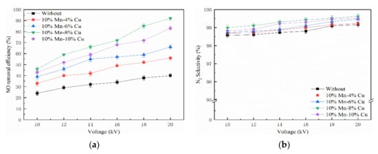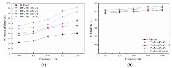 Figure 4 displays that the voltage was positively correlated with the NO removal efficiency in range of 10-20 kV at a frequency of 1000 Hz. The tested concentration of NO and NH3 were 300 ppm and 60 ppm, respectively. The NO removal efficiency was just 39.16% at a voltage of 20 kV only in the presence of NTP, and NO removal efficiency was 92.08% in combination of NTP and 10% Mn-8% Cu/ZSM5 catalyst, increased by 52.92%. The N2 selectivity remained stable at nearly 99%. Du et al. found that more energy would be injected into the NTP system with the increase of voltage, and a lot of active species, free radicals, and high-energy electrons could generate under this condition [50]. On one hand, high-energy electrons could collide with H2O and O2 in the air. The ultimate result is that lots of active species and free radicals would generate in the NTP system, such as ·OH, ·O, and so on. On the other hand, high-energy electrons could collide with pollutant molecules directly or indirectly, and then break the chemical bonds. Clearly, the electric field strength was gradually increased with the voltage increasing. Therefore, the electric field intensity and quantity of plasma generated per unit time increased to the NO removal efficiency.