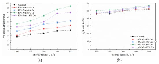 Figure 7 shows the variation of energy density and the NO removal efficiency. The tested concentration of NO and NH3 was 300 ppm and 60 ppm, respectively. The NO removal efficiency was climbing up with the increase of energy density, and Mn-Cu/ZSM5 catalysts enhanced the NO removal efficiencies in the presence of NTP, which presents a straight line that approximated the proportional increase. The NO removal efficiency was only 41.66% without the catalyst at an energy density of 500 J L−1, and NO removal efficiency was 93.89% in combination of NTP and 10% Mn-8% Cu/ZSM5 catalyst, increased by 52.23%, and the selectivity to N2 is almost 99%. The results indicate that the 10% Mn-8% Cu catalyst with plasma exhibits the highest catalytic activity.