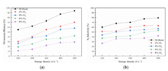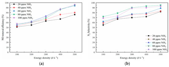Effect of energy density on NO removal efficiency. (a) NO removal efficiency and (b) N2 selectivity.