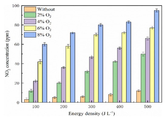 The relationship between energy density and NO2 concentration is presented in Figure 9. In the presence of O2 molecules, the NO2 concentration increased slightly when the energy density was over 100 J L−1, and then the NO2 concentration remained stable with the energy density continually increasing. Ruggeri et al. revealed that NO2 was a key reaction product in the catalytic reaction and the SCR reaction dominated the NO reduction with a catalyst below 200 °C [60]. The electric field of the reaction system was strengthened with the increase of energy density, and more NH3 molecules participated in the reactions with O2 and ·O, which led to new NO2 molecule production. On the one hand, the active species O3, ·O, and ·N formed in the plasma–catalyst system reacted with NO to form different NOx. On the other hand, O3 and ·O could react with NO to oxidize NO to NO2. Koebel et al. found that the NO would be oxidized to higher valence oxides because O3 was more oxidative than O2. So, the NO2 was the main product in the presence of O2 [61]. The oxidation of NO to NO2 could be summarized as the following reactions [62,63,64,65].