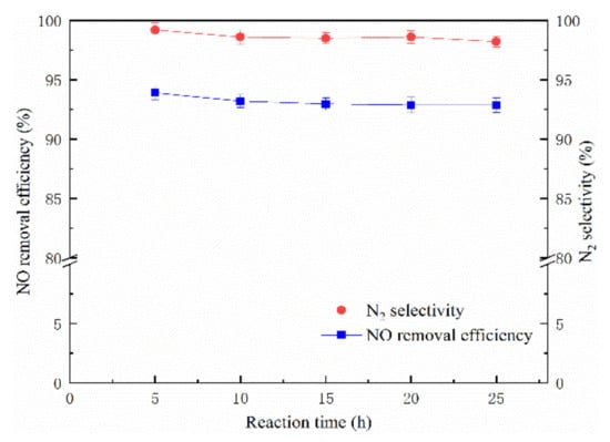 The long-time stability is an important index to evaluate the NO removal efficiency of the 10% Mn-8% Cu/ZSM5 catalyst in the NTP system, which could provide basic research data for the practical applications. The tested concentration of NO and NH3 was 300 ppm and 60 ppm, respectively. The reaction temperature was maintained at 200 °C, and the O2 concentration was 0 and the energy density of plasma was 500 J L−1. As can be seen from Figure 11, a 25 h continuous test was performed in this section, and the long-term stability of the 10% Mn-8% Cu/ZSM5 catalyst at an energy density of 500 J L−1 was explored. The NO removal efficiency of the 10% Mn-8% Cu/ZSM5 catalyst was rather stable with a slight fluctuation around ± 1% after the 25 h of continuous testing, and the NO removal efficiency remained at nearly 93%. At the same time, the N2 selectivity remained stable at nearly 99%, which illustrates that there was almost no deactivation that occurred during the 25 h test at an energy density of 500 J L−1, and further demonstrates that the 10% Mn-8% Cu/ZSM5 catalyst had excellent long-term stability in the NTP system.
