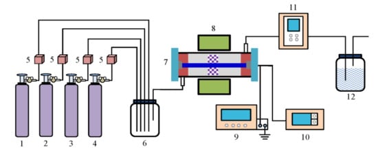 Schematic of the dielectric barrier discharge (DBD) plasma experiment. 1 Ar, 2 O2, 3 NO, 4 NH3, 5 Mass flow controller, 6 Buffer tank, 7 Plasma reactor, 8 Resistance furnace, 9 Power supply, 10 Digital oscilloscope, 11 Gas analyzer, and 12 Alkali absorption.