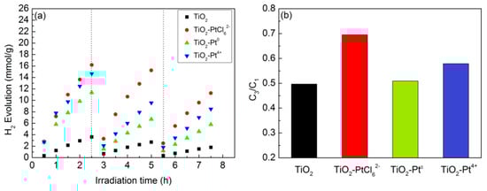 In order to verify the advantageous defect repairing ability of PtCl62− source, the photocurrent characterization was performed on TiO2 samples. In the photocurrent test, the Pt sources with different charges were firstly added into the reaction cell, and in-situ deposited under light irradiation, respectively. As shown in Figure 8a, the maximum photocurrents of all samples decreased gradually with the increase of the on-off cycles, which indicates that the surface defects are produced [35]. We compared the ratio of photocurrent intensity between the first and the third cycle of different samples. The photocurrent intensity of TiO2-PtCl62− in the third cycle was 80% of the first cycle, and its stability was better than that of other samples. The decreased photocurrent of TiO2-Pt4+ was more obvious than TiO2-PtCl62−, but the photocurrent in the third cycle was 70% of the first cycle, which was better than TiO2-Pt0 and TiO2 (60%). The performances are consistent with the results of the Raman and recycle experiments, which confirm that Pt deposited on TiO2 can reduce the recombination of electrons and holes, and H2PtCl6 source can efficiently improve the photostability.