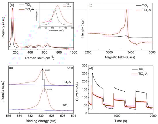 TiO2 and TiO2-A: (a) Raman spectra, inset was the locally magnified Raman spectra (100–200 cm−1); (b) EPR spectra; (c) O 1s XPS spectra; (d) photocurrent result.