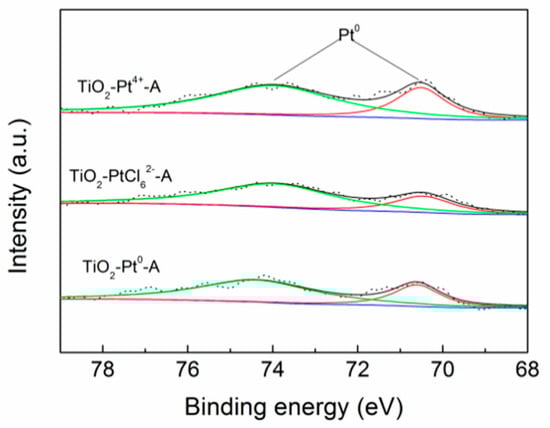 In order to reveal the influences of different charged Pt sources on the stability of photocatalytic H2 evolution, the contents, valence states and particle sizes of Pt on Pt/TiO2 catalysts were investigated in comparison. The Inductively coupled plasma-atomic emission spectroscopy (ICP) test was employed to study the contents of Pt on three kinds of Pt/TiO2 catalysts. As shown in Table S1, the Pt weight ratio of Pt/Ti of all the samples were ca. 0.60 wt%, demonstrating that the contents of Pt were similar. Then the XPS characterization was used to study the valence state of the generated Pt on three Pt/TiO2 samples. In Pt 4f XPS spectra (Figure 3), only the Pt 4f7/2 and Pt 4f5/2 peaks at 70.7 eV and 74.1 eV assigned to Pt0 could be detected [31,32], which indicates that the valence states of Pt introduced via three different sources are consistent. Furthermore, the TEM characterization was carried out to determine the Pt particle size, and the results were shown in Figure 4a–c. The dark spots in TEM images are Pt species. It was observed that Pt is highly dispersed on TiO2 surface. The Pt particle size of all the samples is similar, i.e., 2 nm. While for the TiO2 sample, its particle size is 20 nm. Therefore, the Pt introduced by three Pt sources have the same content, valence state and particle size on the Pt/TiO2 catalysts, suggesting that the different stabilities have little relationship with the Pt properties.
