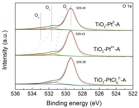 In order to further reveal the reason for the different stabilities on Pt/TiO2 samples via three different Pt sources, the XPS (Figure 5) spectra of O 1s on the used Pt/TiO2 were carried out. The O 1s spectra for the used Pt/TiO2 were fitted into three peaks, i.e., 529.4, 531.6 and 532.9 eV, which were assigned to the O lattice (OL), oxygen vacancies (Ov), and the adsorbed oxygen species on defect sites of TiO2 (Oc) [33]. The results showed that all the peak positions of OL of the used Pt/TiO2 shift to lower binding energy compared with TiO2-A (529.75 eV). Among them, TiO2-PtCl62−-A had the lowest binding energy (529.38 eV), which was similar to the TiO2 before the reaction, suggesting that there were few defects generated on the TiO2-PtCl62− catalyst after the reaction. In addition (Table S1), the ratio of peak areas of A(Oc + Ov)/AOL on TiO2-PtCl62− is also the lowest (10.6%) compared with other used Pt/TiO2 samples, which indicates that the introduction of the negative charged PtCl62− can reduce the amount of defects generated on TiO2 in the photocatalytic H2 evolution, and thus improve the photocatalytic stability.