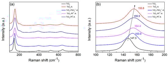 In addition, the Raman spectra were performed to investigate the repair effect of different Pt sources on the defects formed on TiO2 in photocatalytic H2 evolution (Figure 6). It was observed that after loaded with Pt, the blue shift of the peaks attributed to the Ti-O bond was decreased, compared with TiO2-A (156 cm−1). The used TiO2-PtCl62−-A has the smallest blue shift (153 cm−1), TiO2–Pt4+-A followed, and TiO2-Pt0-A had the biggest blue shift. It is suspected that the Pt sources have entered the defects generated by photocorrosion, which repairs the rupture of the Ti–O bond, and thus the blue shift of Raman peak is reduced [34]. Surprisingly, it was found that the blue shift of TiO2-PtCl62−-A is smaller than others, indicating that the effect of electrostatic attraction resulted in the maximum degree of Pt species entering the defects, and thus the repairing ability of H2PtCl6 source is the best.
