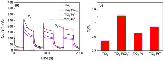 (a) Photocurrents of TiO2, TiO2-Pt0, TiO2-PtCl62− and TiO2-Pt4+; and (b) maximum photocurrent ratios (D3 is the third cycle photocurrent and D1 is the first cycle photocurrent).