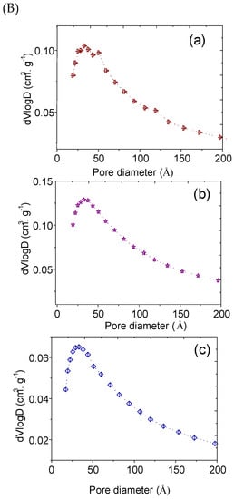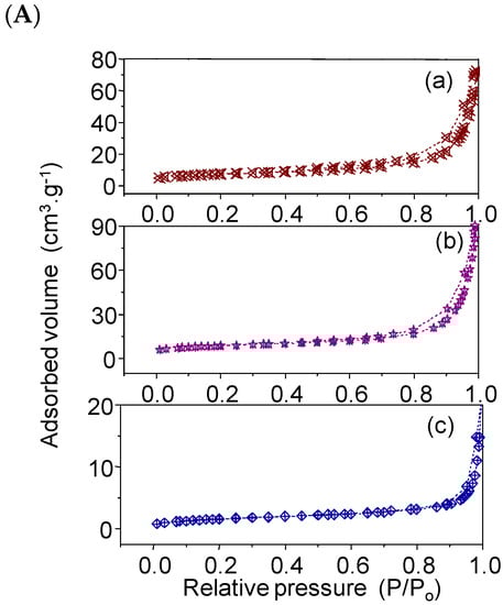 The textural properties of the solids—such as surface areas, and pore volumes and sizes—were obtained by nitrogen adsorption–desorption isotherms at −196 °C in a ASAP 2420 apparatus from Micromeritics (Norcross, GA, USA). Before analyses, the solids were heated at 150 °C under vacuum for 5 h. The surface areas and pore volumes were assessed by the Brunauer–Emmett–Teller (BET) equation whereas the average pore diameters were calculated from the Barrett–Joyner–Halenda (BJH) method to the adsorption curves.