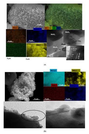 As indicated above, the Raman and XRD assumptions demonstrated the presence of both pseudohexagonal and orthorhombic niobia phases with a long-range order porous structure. The existence of domains of different sizes for PtOx oxide nanoparticles is clearly visible with particle sizes ranging from 1 to 30 nm (Figure 4a, HRTEM images included). Thus, the Pt particles are enveloped by the Mo ones, the former being not well dispersed on the support, SEM-EDS. Also, this result is corroborated by the textural properties that illustrate low values of surface area and pore volumes due to the formation of large PtOx particles.