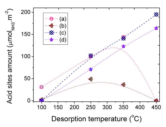 Acid sites amount in function of the desorption temperature of the catalysts: (a) Nb2O5, (b) CoMo/Nb2O5, (c) PtMo/Nb2O5 and (d) NiMo/Nb2O5.