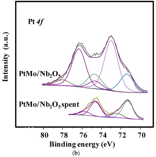 The Pt 4f core level spectra of PtMo/Nb2O5 sample is shown in Figure 6b. The deconvolution of the spectra reveals three doublets at low BE for Pt 4f7/2 peak at 71.4 eV (16%), 73.0 (70%), and 74.7 eV (14%). A peak overlapping with the peak at 74.7 eV along with two peaks at 76.1 and 77.4 eV can be found for Pt 4f5/2 (Figure 6b). According to the findings, the BE at 73.0 and 74.7 eV are due to Pt2+ from PtOx species, whereas the contribution at 74.7 and 77.4 eV are assigned to the presence of Pt4+ species [33,34]. The minor contribution at 71.4 eV is associated with the Pt° [33], although this specie is not probable in the fresh catalyst. Moreover, the Mo/Nb ratio for PtMo/Nb2O5 sample is 0.254, being higher than that of CoMo/Nb2O5 indicating that Mo particles are mostly exposed on surface of the PtMo/Nb2O5 catalyst.